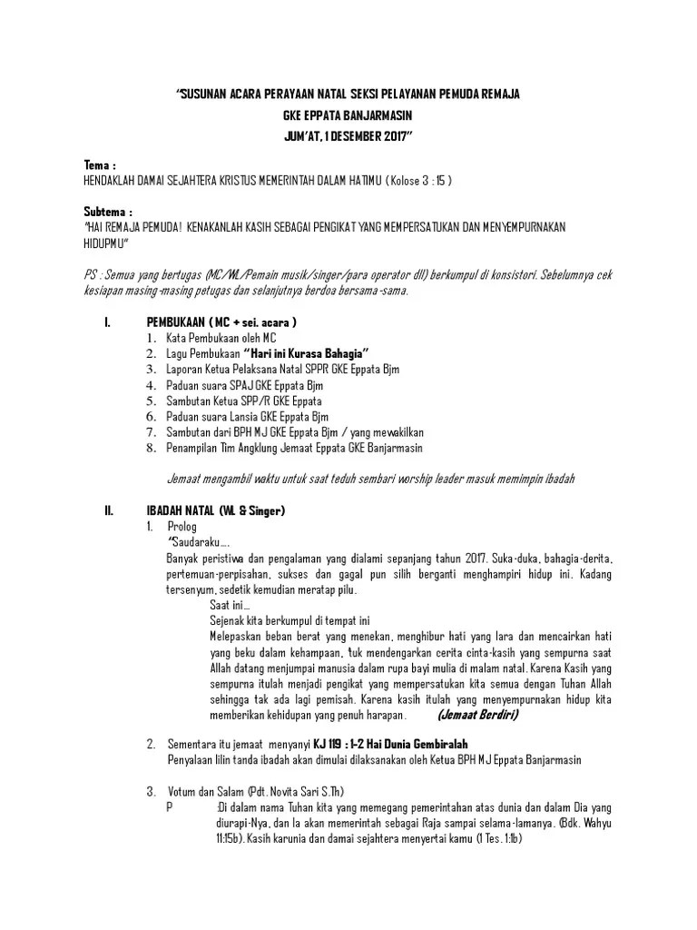 Di dalam nama allah bapa dan tuhan yesus kristus serta persekutuan roh 1. Mosalnya kita mau maju dan sukses. Dalam hidup ini kita akan menemukan banyak sekali perbedaan di sekitar kita, seperti perbedaan agama, ras, etnik, fisik, kulit, bahasa, su. Kata kata pembukaan mc ibadah natal / kata kata pembukaan mc ibadah natal : Kata pembuka oleh mc 2. Majalah holong perayaan natal wijk paal merah lama hkbp. Contoh susunan acara natal pemuda doc document cute766 : Pujian dan tarian (kelas 6 & 5) kudus, pencipta langit dan bumi. Mari kita kembali kepadanya selamat menyambut ibadah puasa, mohon dimaafkan khilaf dan salah, lahirian dan batiniah. Kata kata pembukaan mc ibadah natal : Sebelum masuk ke contoh kalimat atau kata kata doa pembukaan ibadah, sebaiknya terlebih dahulu kita mengetahui apa sih yang dimaksud dengan doa pembuka ibadah dalam agama kristen baik katolik maupun protestan yang bisa dibaca seorang pendeta ketika acara kebaktian? Ibadah perayaan natal ukm pmk stikom bali. Kata mutiara natal adalah ungkapan syukur atas karunia yang telah dilimpahkan oleh tuhan yang maha esa.